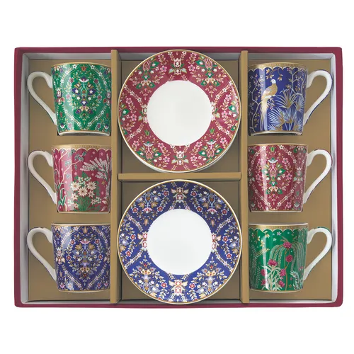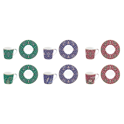 Dodajte svojim kávovým rituálom kráľovský punc. Táto súprava od Easy Life je stelesnením elegancie a detailnej remeselnej práce. Hlboké odtiene smaragdovej, kráľovskej modrej a rubínovej v kombinácii so zlatým lemovaním a bohatými orientálnymi vzormi vytvárajú z pitia kávy skutočný obrad.