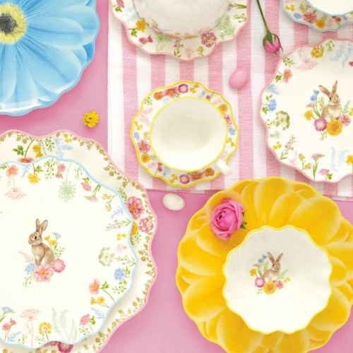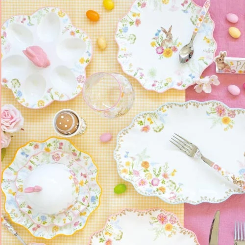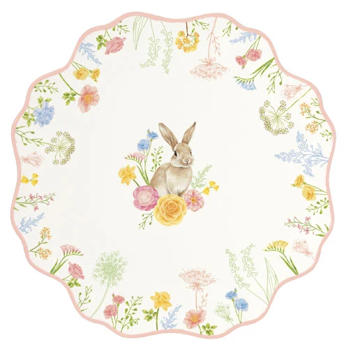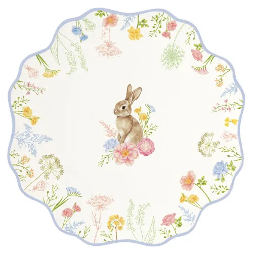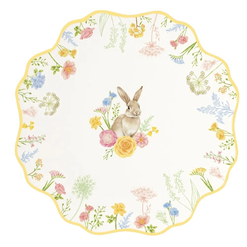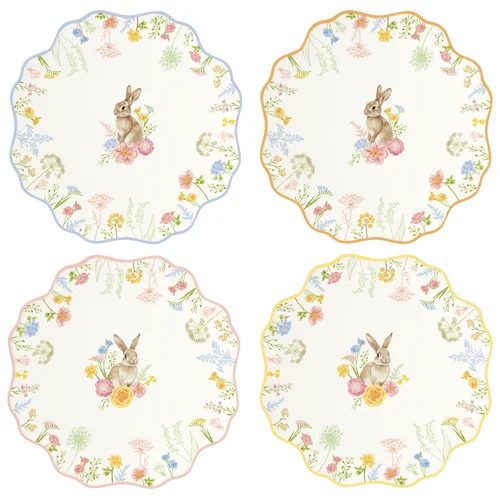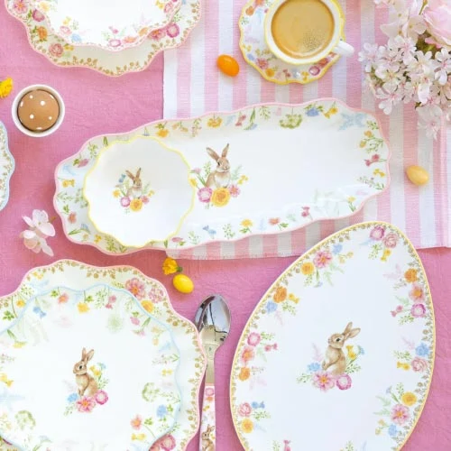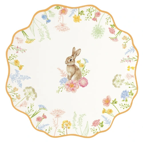Dodajte vašim sviatkom punc elegancie s touto exkluzívnou sadou dezertných tanierov. Každý tanier v sete zdobí detailná ilustrácia zajačika obklopeného poľnými kvetmi, pričom jemné farebné odlíšenie okrajov (modrá, oranžová, ružová a žltá) dodáva prestieraniu dynamiku a šarm.